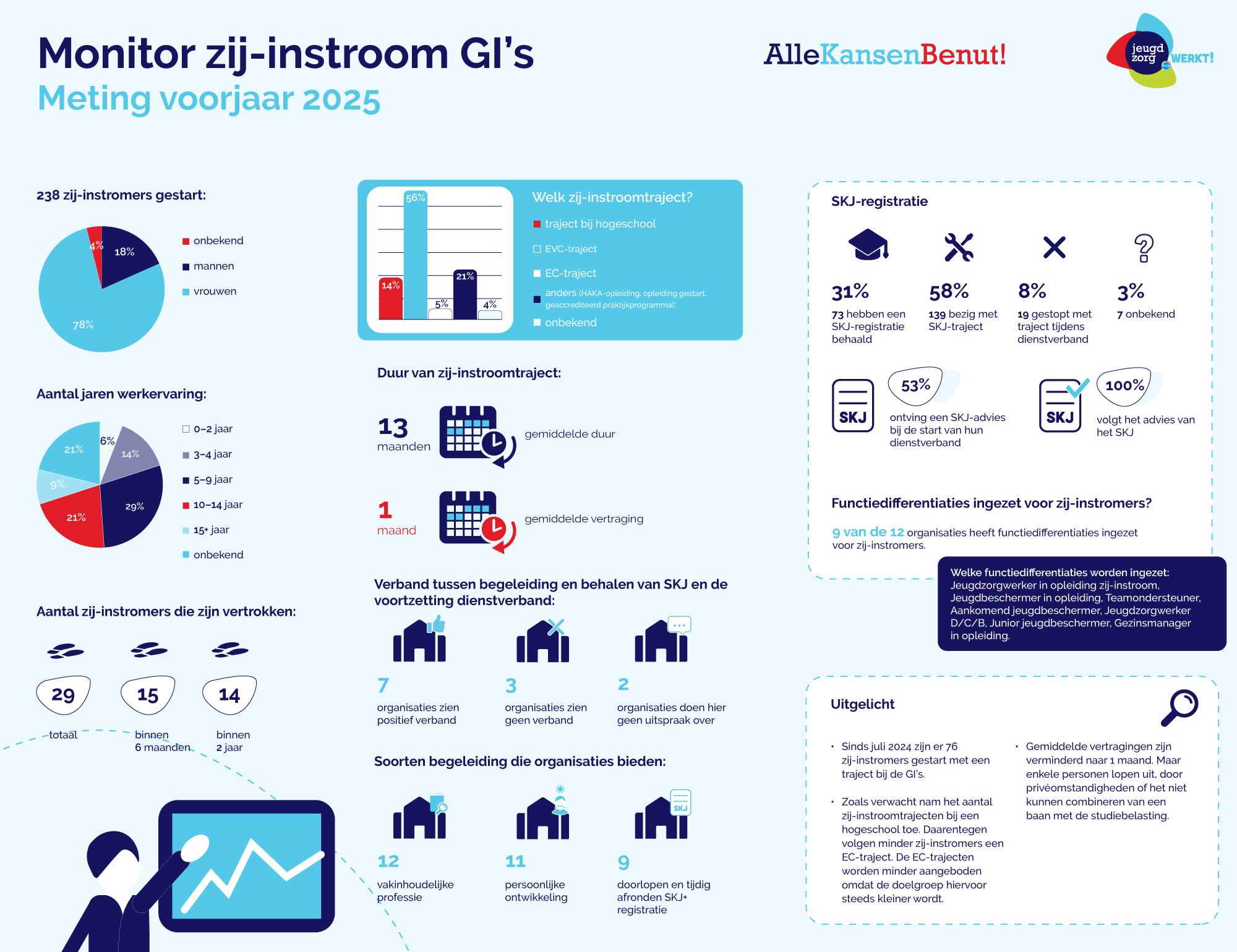 In 2023 stelde het ministerie van Justitie en Veiligheid de regeling subsidie zij-instromers GI beschikbaar voor alle gecertificeerde instellingen in jeugdzorg. Onderdeel van deze regeling is het verzorgen van een kwalitatieve monitor. Inmiddels zijn de uitkomsten van de voorjaarsmeting van 2025 bekend. Deze zijn weergegeven in onderstaande infographic.